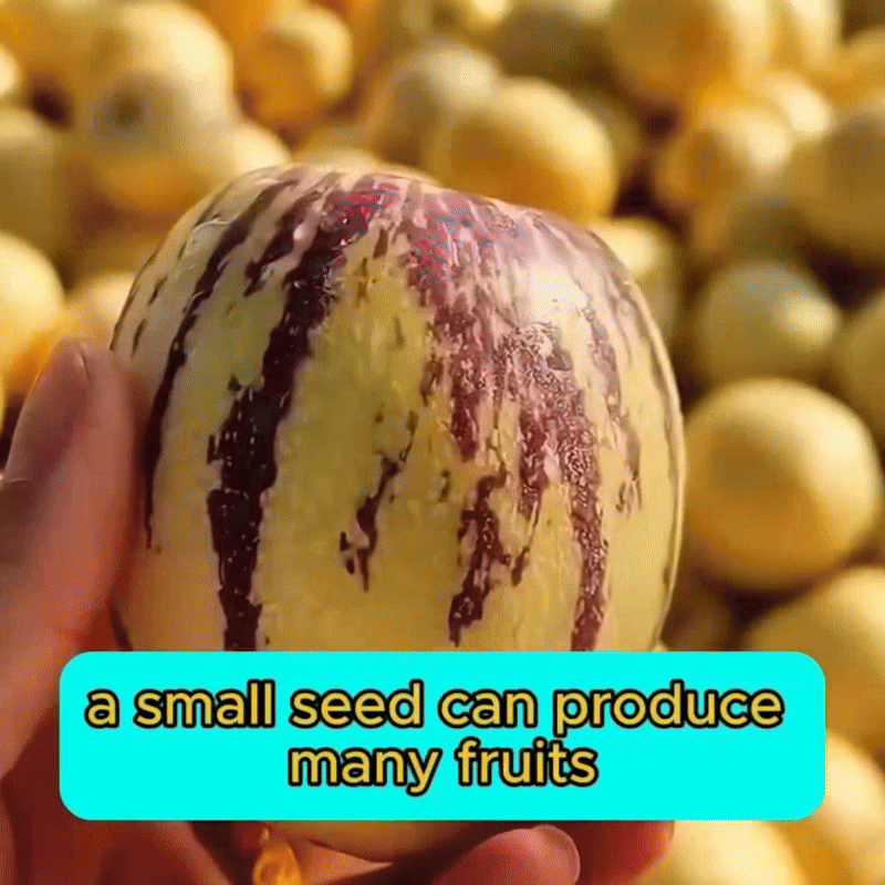 Плоди пепіно мають овальну форму, жовте забарвлення з поздовжніми смужками по всій довжині. Залежно від сорту, маса фрукта становить від 50 до 700 грамів. За динний смак і зовнішню схожість з грушею пепіно також називають динною грушею. Рослина належить до сімейства пасльонових, це багаторічний чагарник, що досягає висоти 150 см. Цвітіння пепіно дуже схоже на цвітіння картоплі, а при дозріванні плоди схожі на томати, дивися фото.